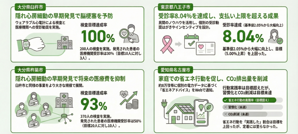 これらの事業は、いずれも民間事業者のノウハウを活用し、客観的な成果指標に基づいて支払額を決定するモデル性の高い取組として実施されました。