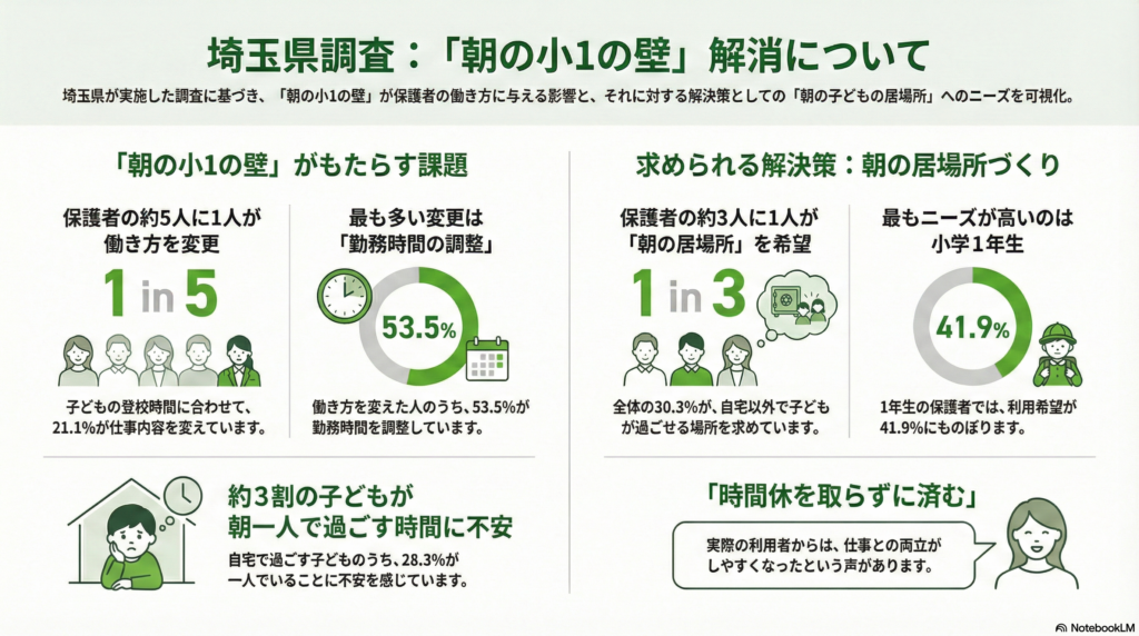 埼玉県は「朝の小1の壁」を「こどもの小学校入学に際して、保育所の預かり開始時間と小学校の登校時間の差により保護者等が仕事等を変更せざるを得ない状況」と定義しています。